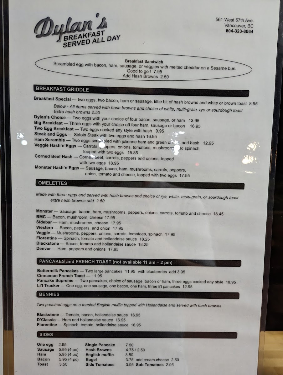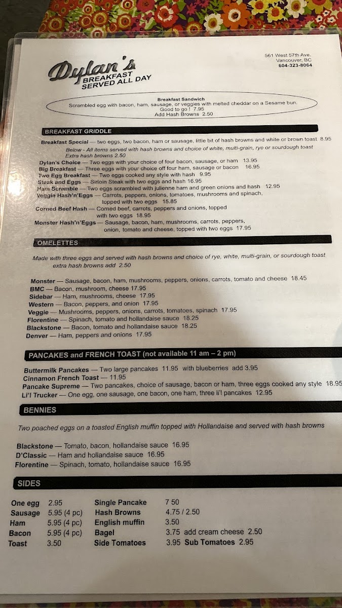 Welcome to Dylan's, a charming diner tucked away at 561 W 57th Ave in Vancouver. Known for its homey atmosphere, this eatery offers an extensive menu that celebrates classic diner fare. Start your day with a hearty breakfast featuring options like the Monster Hash'n'eggs or the savory Steak and Eggs. For lunch, indulge in their signature Reuben Sandwich or the comforting Grilled Cheese, all expertly prepared and reasonably priced.
